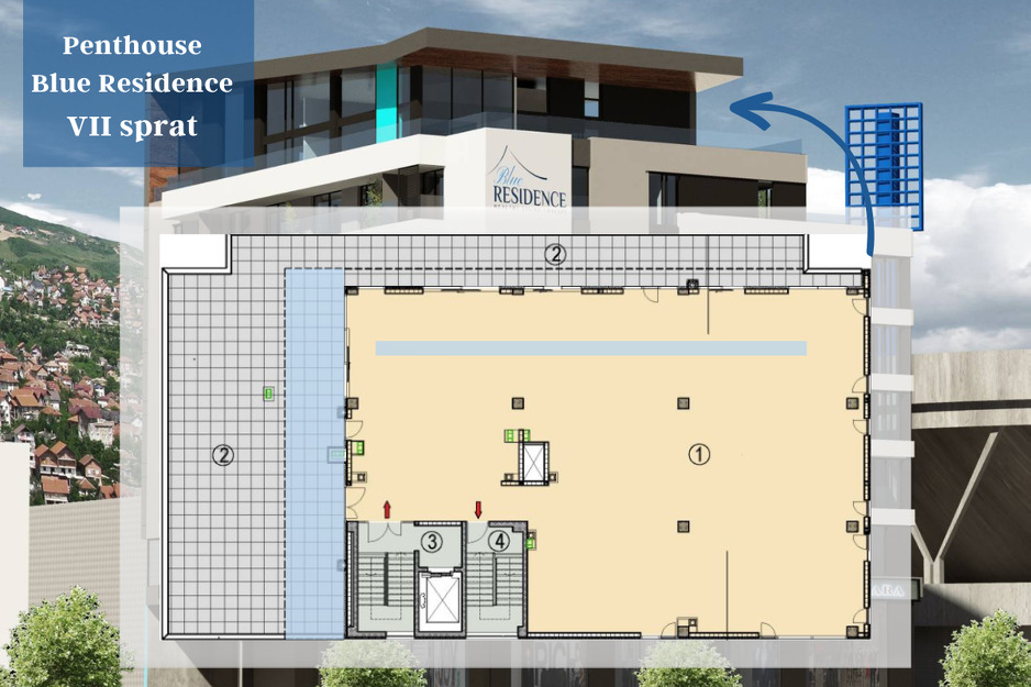 Blue Residence se može pohvaliti unikatnom jedinicom, prilika kakvu rijetko možete pronaći u Sarajevu. Radi se o penthouse jedinici na sedmom spratu objekta. Savršen izbor za kompanije koje traže moderan, kvalitetan i veliki prostor sa terasom i sa savršenim pogledom na grad.